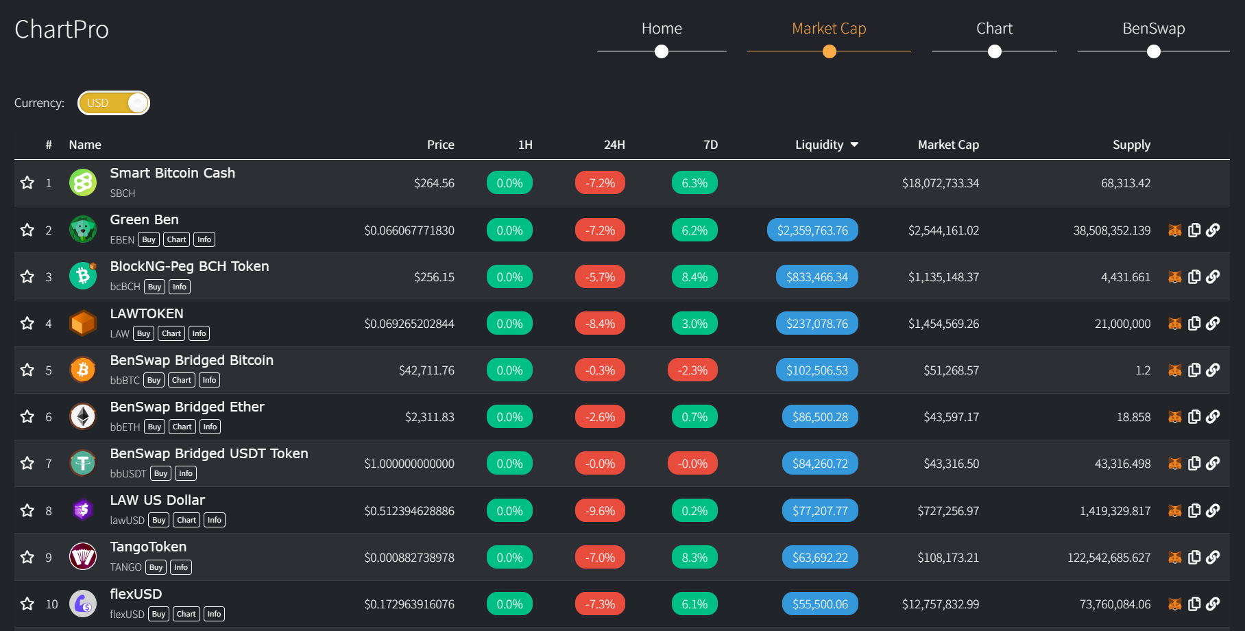 1. 任何在BenSwap AMM上有最低流动性的代币都会被自动添加到ChartPro以及Market Cap，请查看[最低流动性要求](https://docs.benswap.cash/zhong-wen/features/chartpro)。